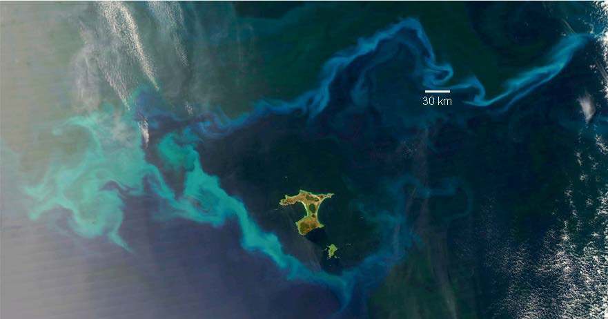 This image of Chatham Island, off the coast of New Zealand, was taken by MODIS. The blue wispy pattern (upper right) is a phytoplankton bloom that is being stretched and stirred by ocean eddies. Images like this one verify that high-resolution numerical models accurately reproduce oceanic motions and provide insight into how these small-scale currents influence Southern Ocean ecosystems.