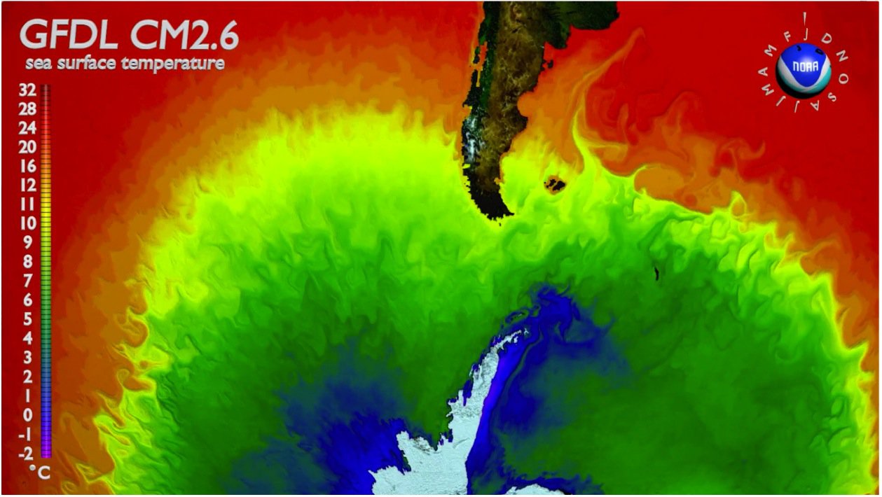 In this sea-surface temperature map created by a NOAA Geophysical Fluid Dynamics Laboratory model, Southern Ocean waters (green and blue) represent regions where cold water rises up to the surface, warms, and moves northward.