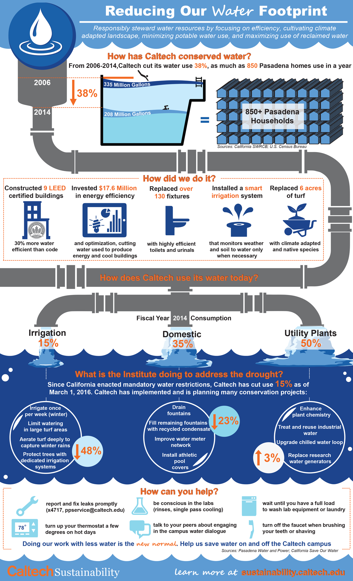 At Caltech that call to action has been more of an affirmation of efforts already under way for more than a decade. Since 2006, Caltech has targeted energy- and water-wasting activities campus-wide, slashing water use by 38 percent.