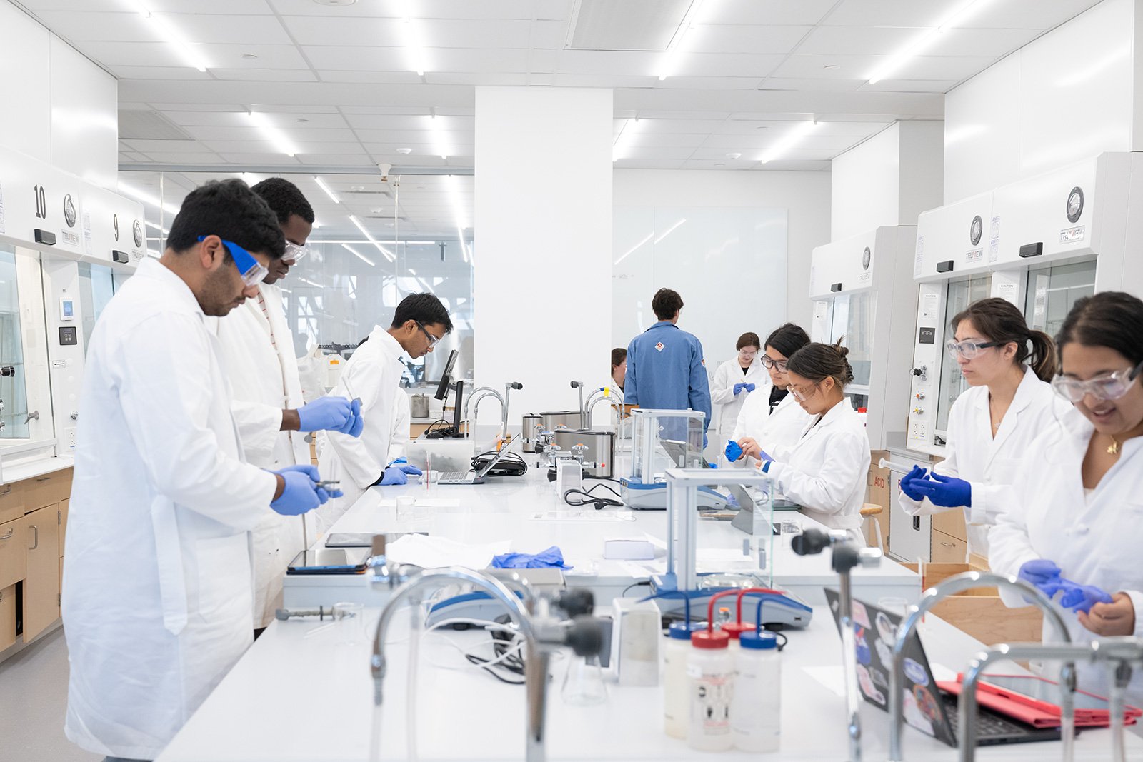 Since all Caltech undergraduate students are required to take an introductory chemistry lab (either Chem 3a or Chem 3x) sometime during their first two years, all members of the class of 2028 will have a lab course in the new building. Students are already helping to launch the new space and, as the year progresses, will be surrounded by innovations in sustainability research.