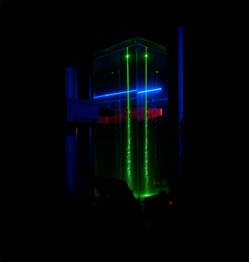 To study this behavior in the laboratory, Dabiri and Wilhelmus use a combination of blue and green lasers to induce the shrimp to migrate upward inside a big tank of water. The green laser at the top of the tank provides a bright target for the shrimp to swim toward while a blue laser rising along the side of the tank lights up a path to guide them upward.